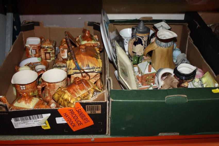 A TRAY OF COTTAGE SHAPED TEA WARE TOGETHER WITH A TRAY OF ASSORTED CERAMICS TO INCLUDE COALPORT COTTAGE FIGURES