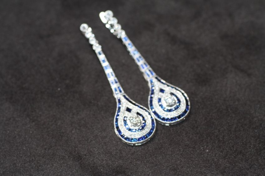 A PAIR OF ART DECO STYLE SAPPHIRE AND DIAMOND DROP EARRINGS, set with 1.38ct diamonds, approx and 2.95ct sapphires, approx. Boxed