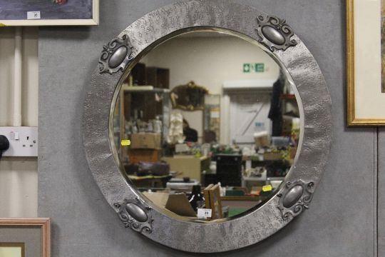 A MODERN SILVER FRAMED CIRCULAR BEVEL EDGED WALL MIRROR