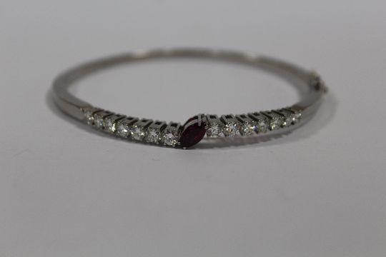 A BOXED LADIES WHITE METAL BANGLE SET WITH A CENTRAL MARQUIS CUT RUBY AND FOURTEEN PRINCESS CUT DIAMONDS