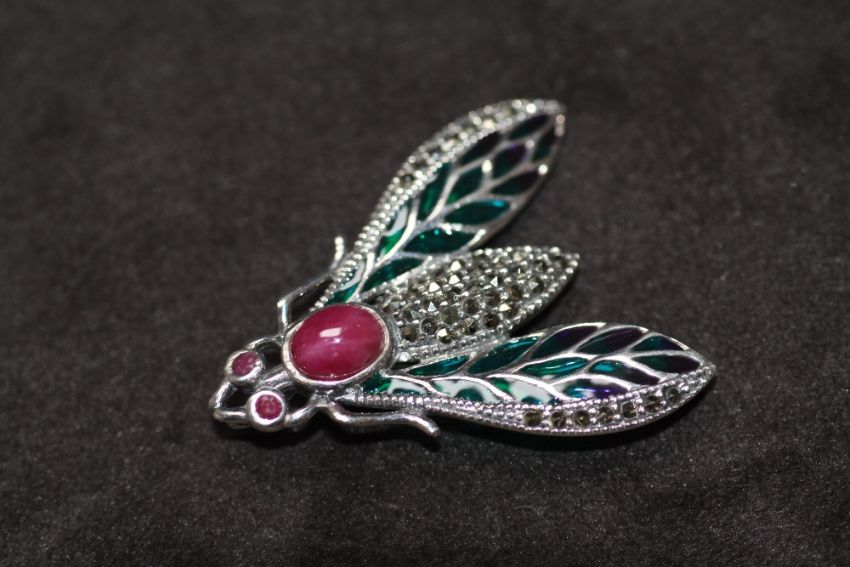 A LARGE SILVER PLIQUE A JOUR FLY BROOCH / PENDANT, set with cabochon ruby, ruby eyes and marcasites