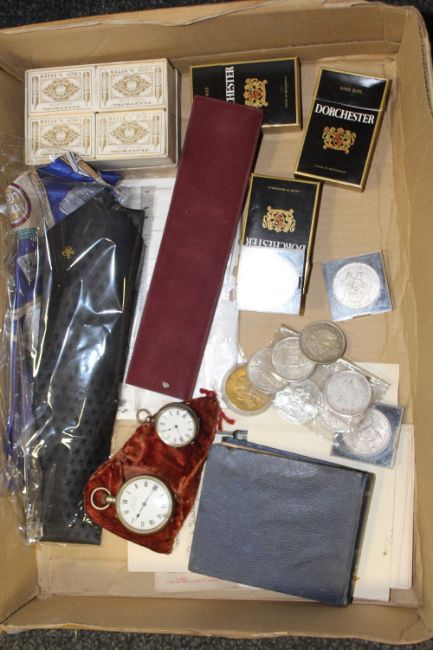 A TRAY OF COLLECTABLES TO INCLUDE A SILVER FOB WATCH, COINS ETC