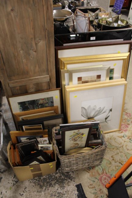 A LARGE QUANTITY OF MODERN PICTURES AND PRINTS TO INCLUDE A DIAMANTE MIRROR, COACHING PRINTS ETC....