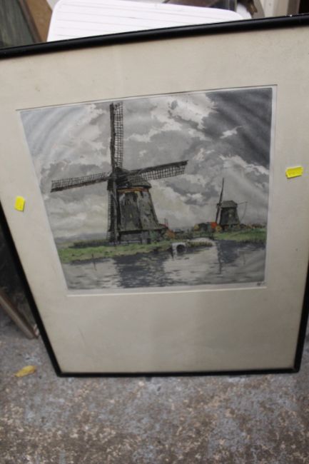 A FRAMED AND GLAZED COLOURED ETCHING DEPICTING A WINDMILL SIGNED HANS FIGURA