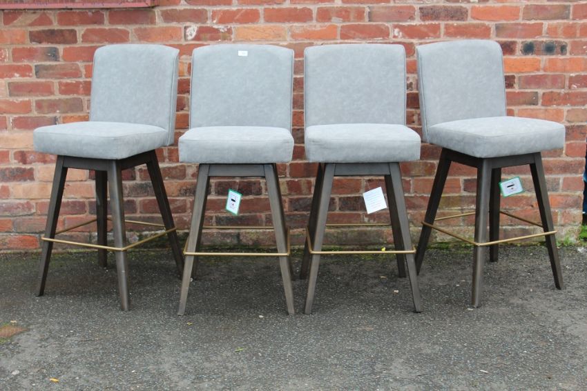 A SET OF FOUR MODERN GREY UPHOLSTERED SWIVEL BAR STOOLS