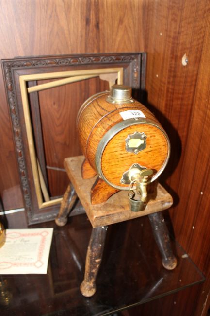 A MINIATURE OAK SPIRIT CASK WITH SILVER PLATED MOUNTS, TOGETHER WITH A SMALL WOODEN STOOL AND A PAIR OF CARVED OAK PICTURE FRAMES (4)