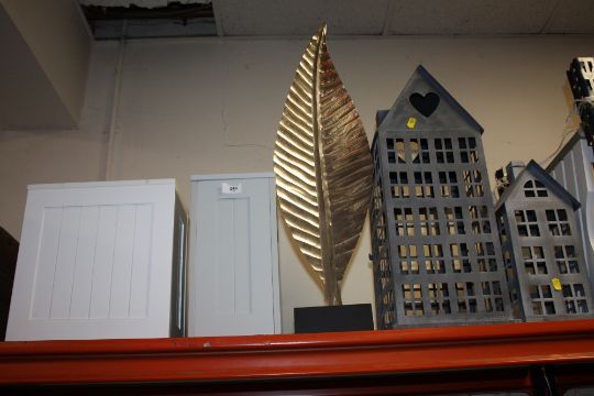 TWO MODERN DECORATIVE CANDLE HOLDERS TOGETHER WITH A LARGE MODERN LEAF ORNAMENT AND WOODEN STORAGE BOXES