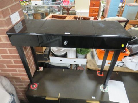 A MODERN BLACK GLOSS CONSOLE TABLE - H 76 cm, W 100 cm - CRACKED GLASS TO THE FRONT