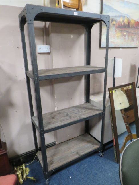 A MODERN INDUSTRIAL STYLE METAL AND WOODEN OPEN BOOKCASE ON WHEELS H 180 cm