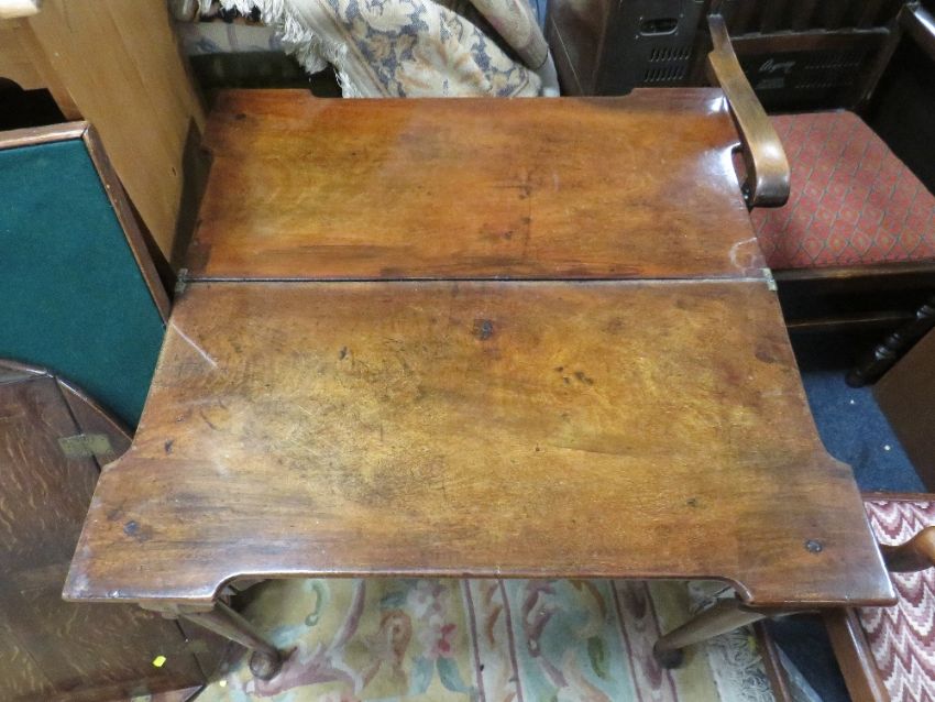 AN ANTIQUE MAHOGANY FOLD-OUT TEA-TABLE