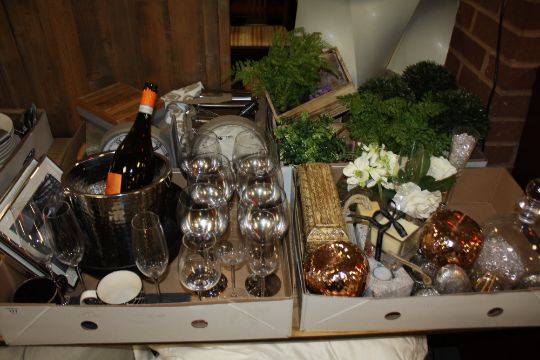 FOUR TRAYS OF MODERN EX SHOW HOME ORNAMENTS AND GLASSWARE TO INCLUDE CLOCKS ETC.