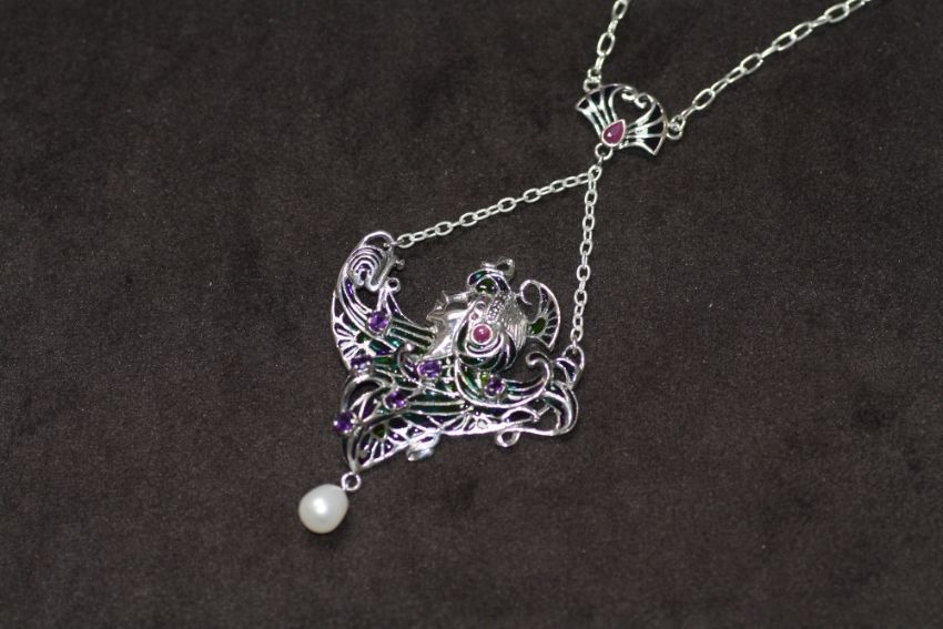 A SILVER PLIQUE A JOUR GYPSY / EXOTIC DANCER NECKLACE, set with a suspended pearl, rubies, amethysts and marcasites