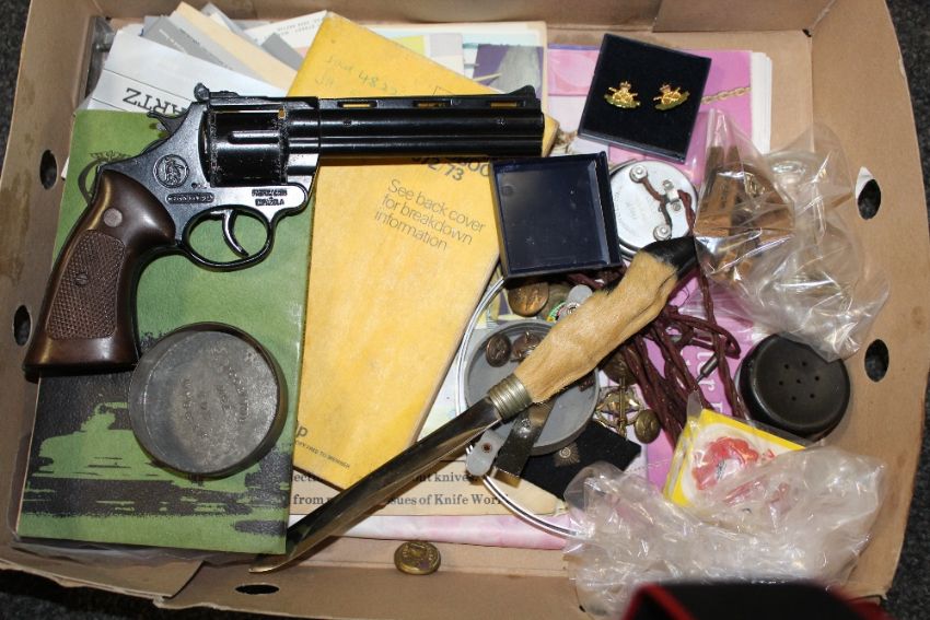 A TRAY OF COLLECTABLES TO INCLUDE A PYTHON 123 GONHER CAP GUN, TAXIDERMY HOOF HANDLED KNIFE ETC