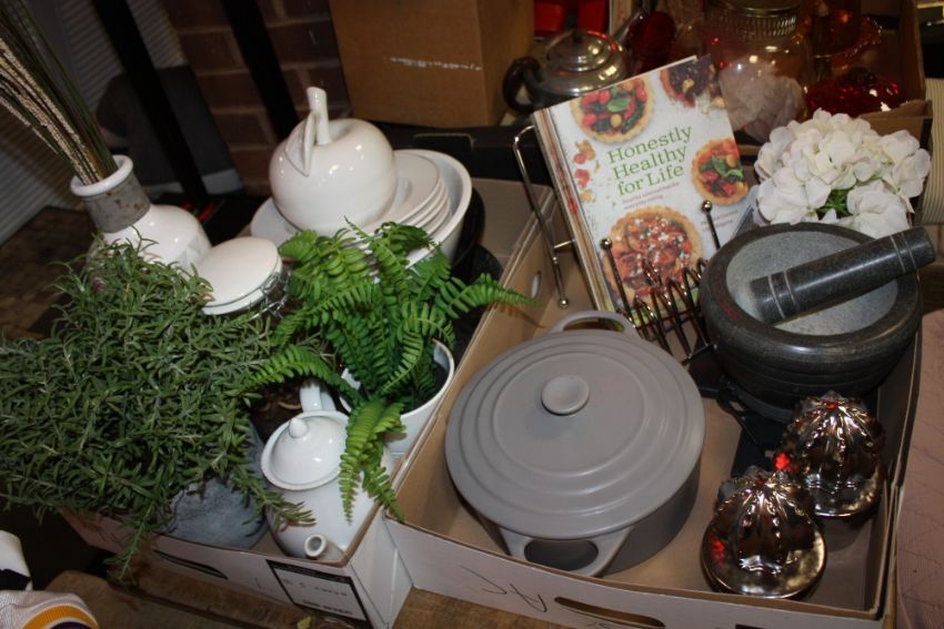 TWO BOXES OF MODERN EX SHOW HOME KITCHENALIA TO INCLUDE A TWIN HANDLED COOKING POT, PESTLE AND MORTAR ETC.