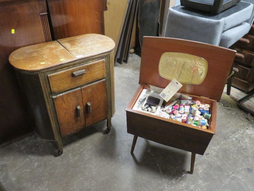 A DECO STYLE OAK DRINKS CABINET / TROLLEY, H 71 cm, TOGETHER WITH A RETRO SEWING BOX - BOTH A/F
