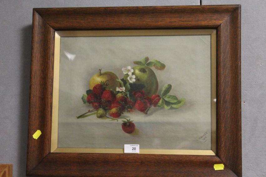 AN OAK FRAMED AND GLAZED OIL ON CANVAS SILL LIFE STUDY OF FRUIT SIGNED L. GROVES 1915