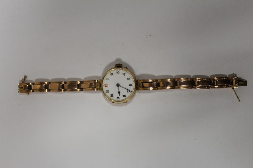 A VINTAGE HALLMARKED 9 CARAT GOLD CASED WRISTWATCH WITH ENAMEL DIAL ON 9CT GOLD EXPANDABLE BRACELET