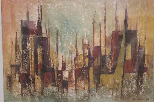 A FRAMED AND GLAZED JOHN BULLOCK PRINT ENTITLED CITY LANDSCAPE