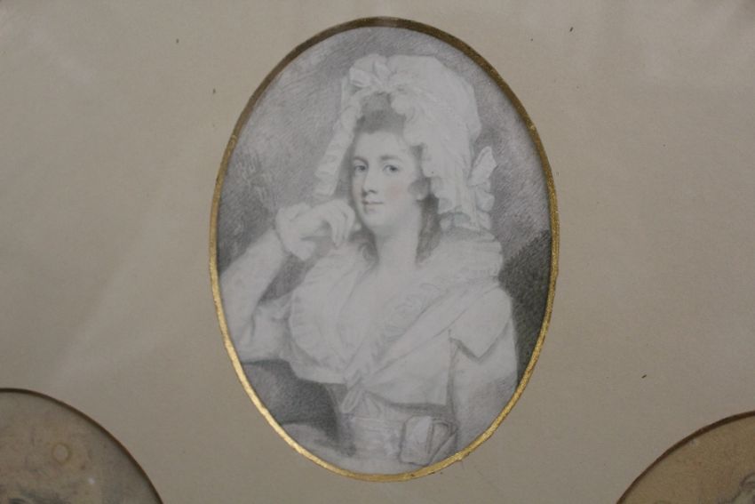 A GILT FRAMED STUDY OF FOUR DRAWINGS DEPICTING CLASSICAL FEMALE PORTRAITS WITH GAINSBOROUGH INTEREST