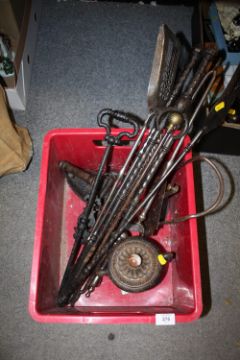 A BOX OF ANTIQUE FIRE IRONS, CAST METAL URN WITH ONYX POMMEL, IRON ETC.