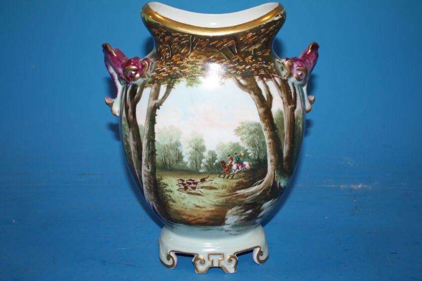 A HAND PAINTED TWIN HANDLED CERAMIC VASE DECORATED WITH A HUNTING SCENE