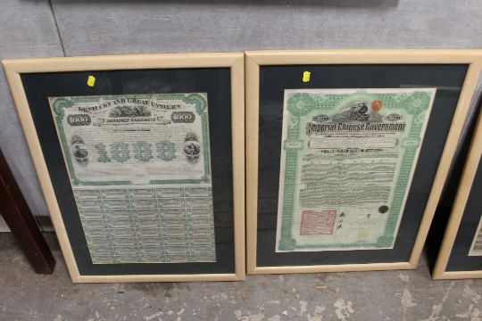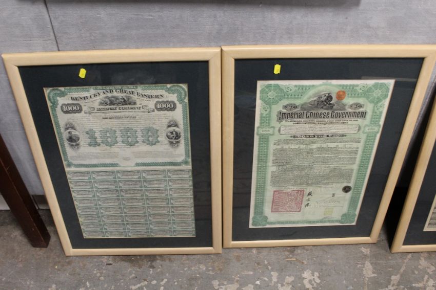 TWO FRAMED AND GLAZED RAILWAY INTEREST BONDS COMPRISING OF A KENTUCKY AND GREAT EASTERN RAILWAY COMPANY 1000 DOLLARS AND AN IMPERIAL CHINESE GOVERNMENT HUKANG RAILWAYS BOND FOR £20