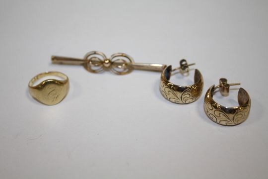 A BAG OF 9 CARAT GOLD AND YELLOW METAL TO INCLUDE A SIGNET RING, BAR BROOCH ETC