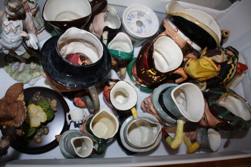 A TRAY OF ASSORTED CHINA AND CERAMICS TO INCLUDE A CROWN DUCAL CRIES OF LONDON TEAPOT ON STAND, COALPORT ETC. TOGETHER WITH A TRAY OF CHARACTER JUGS TO INCLUDE A BESWICK EXAMPLE (2)