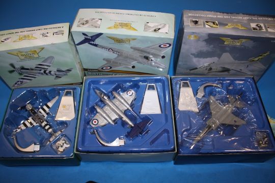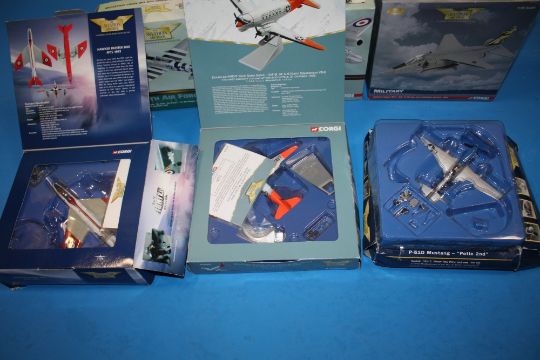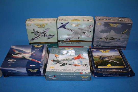 A COLLECTION OF CORGI 'THE AVIATION ARCHIVE' DIE CAST MODEL AEROPLANES, COMPRISING OF - AA35403 SEPECAT JAGUAR GR.3 - RAF 16 (R) SQN, RAF COLTISHALL, NORFOLK, 2005, AA33806 EIGHTH AIR FORCE COLLECTION P47D THUNDERBOLT 'NO GUTS - NO GLORY!' LT BEN MAYO CMD. OFFICER 82ND FS/78 FG DUXFORD 1944, AA35001 BIRTH OF THE COLD WAR GLOSTER METEOR F.MK 8 NO 500 (ROYAL AUXILIARY AIR FORCE) SQUADRON, RAF WEST MALING KENT 1953, AA32204VP-51D MUSTANG - 'PETIE 2ND', AA30002 DOUGLAS RD4-5 'QUE SERA SERA' 12418 PF U.S. NAVY SQUADRON VX-6, 49803 HAWKER HUNTER MK6 4FTS 1973 (9)
