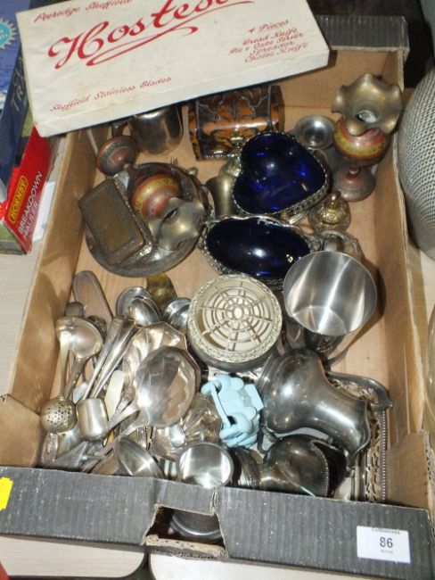 A TRAY OF ASSORTED METALWARE TO INCLUDE A QUANTITY OF SILVER PLATED CUTLERY