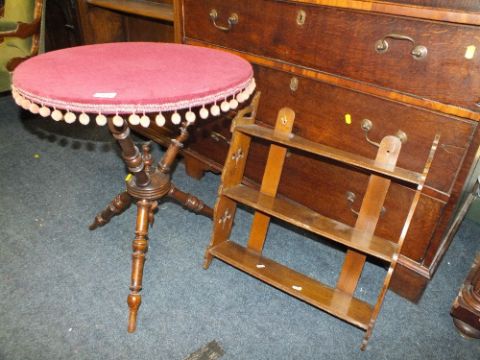 A TRADITIONAL GYPSY STYLE OCCASIONAL TABLE WITH A SMALL SET OF HANGING SHELVES (2)