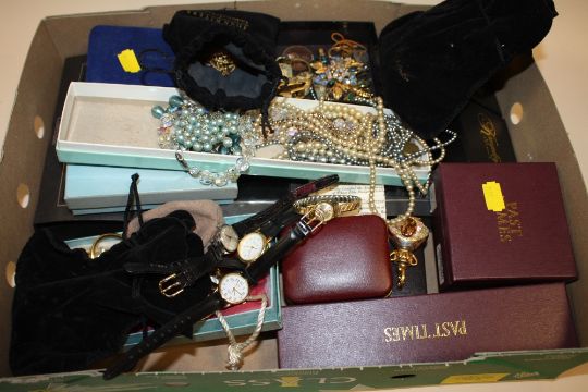 A BOX OF ASSORTED COSTUME JEWELLERY, WRISTWATCHES ETC