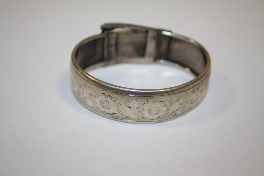 AN ANTIQUE ENGRAVED STERLING SILVER BANGLE