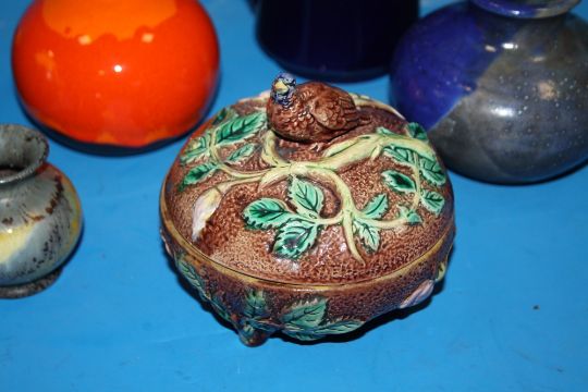 A COLLECTION OF STUDIO POTTERY TOGETHER WITH A MAJOLICA LIDDED POT S/D
