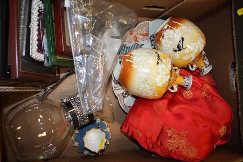A TRAY OF ASSORTED SUNDRIES TO INCLUDE A PAIR OF TWIN HANDLED VASES, TOGETHER WITH A JUG AND BOWL SET AND AN ICE P[AIL FOR RESTORATION