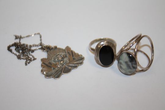 A SILVER PENDANT ON CHAIN, LOCKET RING AND ANOTHER (3)