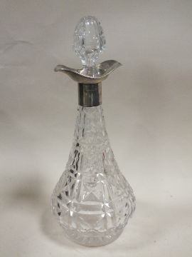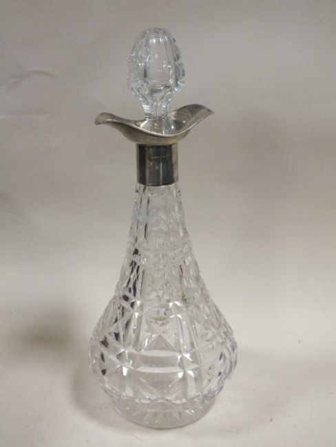 A LARGE CUT GLASS DECANTER WITH HALLMARKED SILVER COLLAR