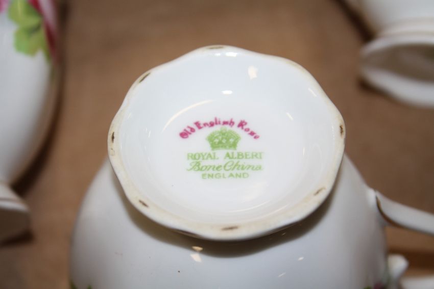 A TRAY OF ROYAL ALBERT OLD ENGLISH ROSE CHINA TO INCLUDE TEAPOT, LIDDED JUG ETC