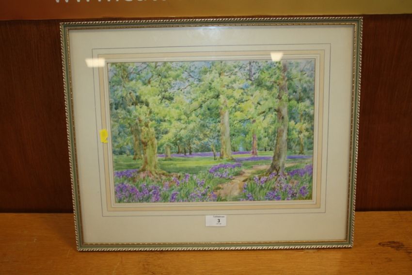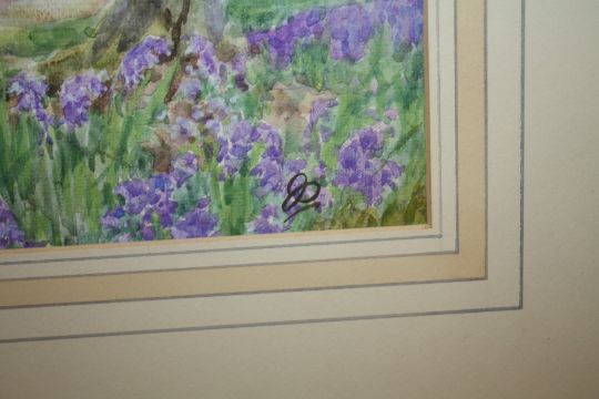 A FRAMED AND GLAZED WATERCOLOUR ENTITLED 'BLUEBELLS IN AN OAK WOOD' BY F. ALAN WHITE