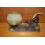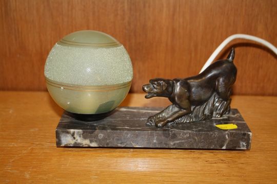 AN ART DECO STYLE MARBLE BASED TABLE LAMP WITH DOG FINIAL AND GREEN GLASS SHADE
