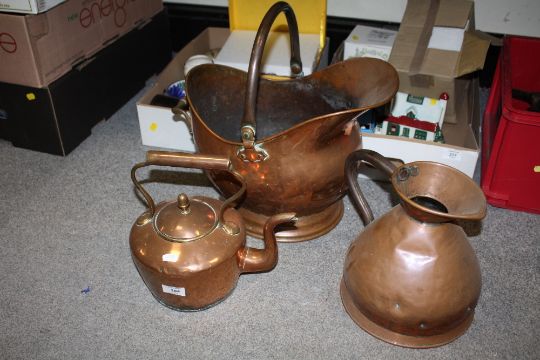 A COPPER HELMET SHAPED COAL BUCKET, TOGETHER WITH A COPPER KETTLE AND A COPPER GALLON JUG (3)