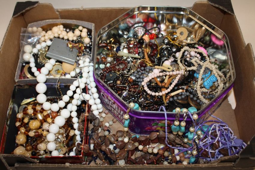 A BOX OF ASSORTED COSTUME JEWELLERY