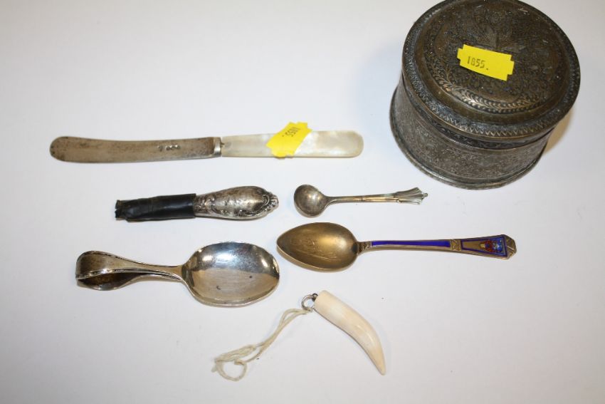 A COLLECTION OF HALLMARKED SILVER AND WHITE METAL TO INCLUDE AN EASTERN STYLE TRINKET BOX, SILVER GILT AND ENAMEL TEA SPOON, MOTHER OF PEARL HANDLED BUTTER KNIFE ETC