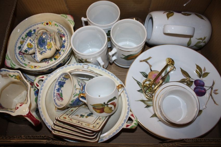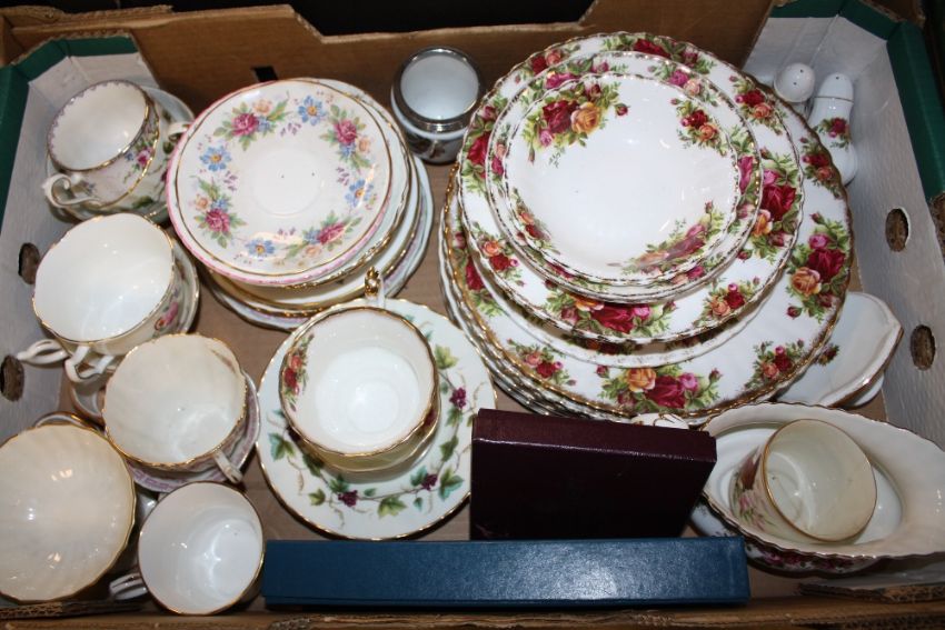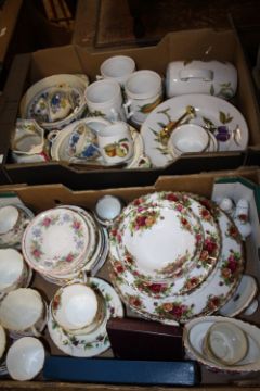 TWO TRAYS OF ASSORTED CHINA TO INCLUDE ROYAL ALBERT OLD COUNTRY ROSES, ROYAL WORCESTER EVESHAM, MASONS ETC.