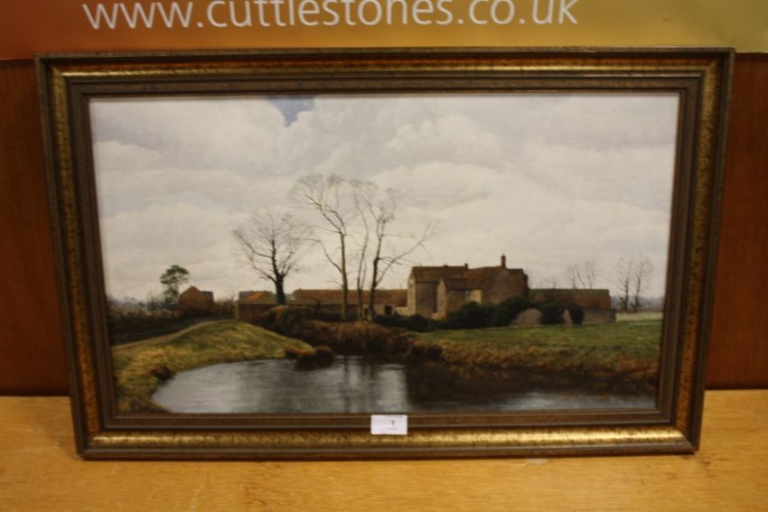 A GILT FRAMED OIL ON CANVAS DEPICTING A COUNTRY FARM HOUSE SIGNED JONATHAN EMERY 1976