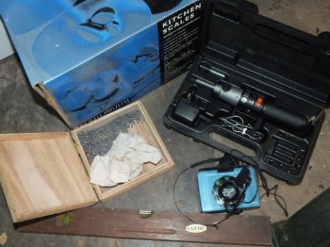 A BOX OF TOOLBITS ETC TO INCLUDE CASED SCREWDRIVER, DRILL BITS, KITCHEN SCALES ETC