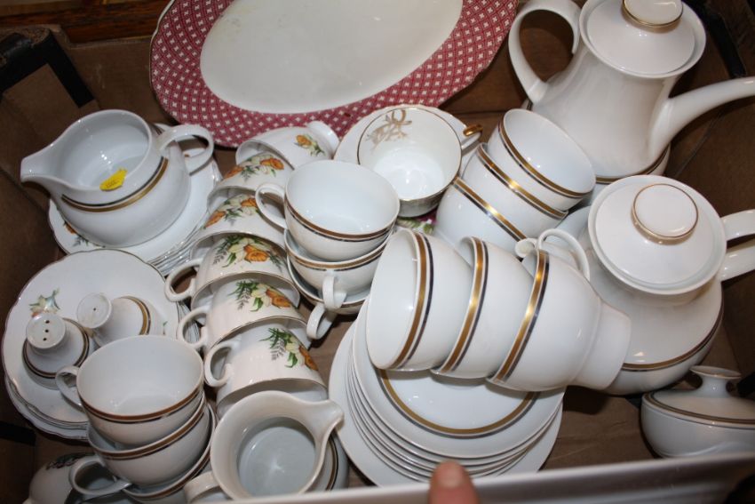 TWO TRAYS OF ASSORTED TEA AND DINNERWARE TO INCLUDE ROYAL SWAN CHINESE FRET, THOMAS GERMAN CHINA ETC.