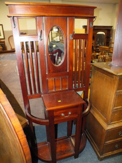 A REPRODUCTION MAHOGANY HALLSTAND WITH SINGLE DRAWER H-180 W-85 CM