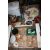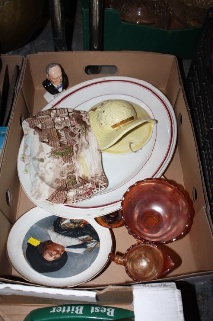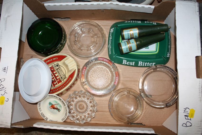 A TRAY OF BREWERY RELATED ASH TRAYS TOGETHER WITH A TRAY OF CERAMICS AND A TRAY OF METALWARE TO INCLUDE AN ENAMEL BREAD BIN