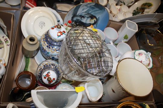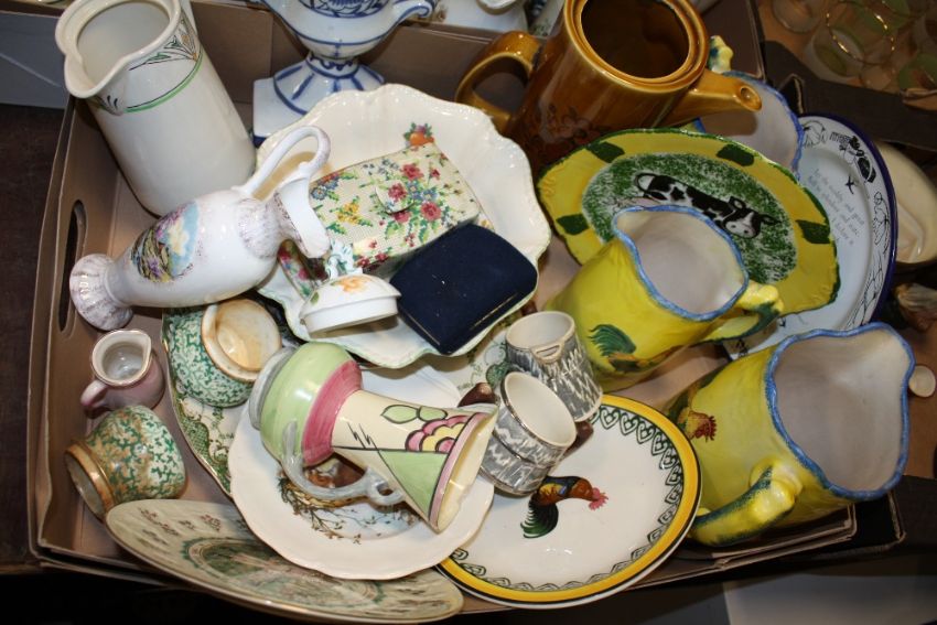 THREE TRAYS OF ASSORTED CERAMICS TO INCLUDE A GRADUATED SET OF THREE J&S COCKREL PATTERN JUGS, ROYAL ALBERT OLD COUNTRY ROSES VASE ROYAL WINTON ETC.